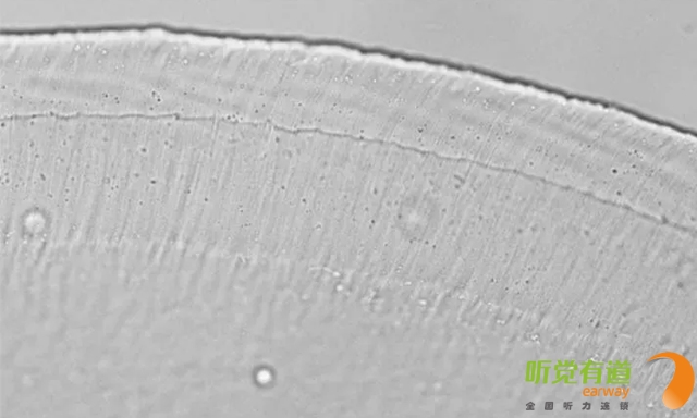 該圖像通過光學顯微鏡拍攝,顯示了覆蓋膜的橫截面,這是一種凝膠狀結構,位于內耳上的微小毛發頂部。