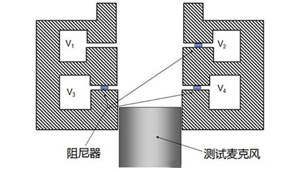 耳模擬器主要由4個小管腔和1個大管腔組成,每個小管腔的體積約為0.1cc-0.22cc(圖中V1、V2、V3、V4),通過一根細管與大管腔相連,其中三個小管腔還設有阻尼(圖中V2、V3、V4)。