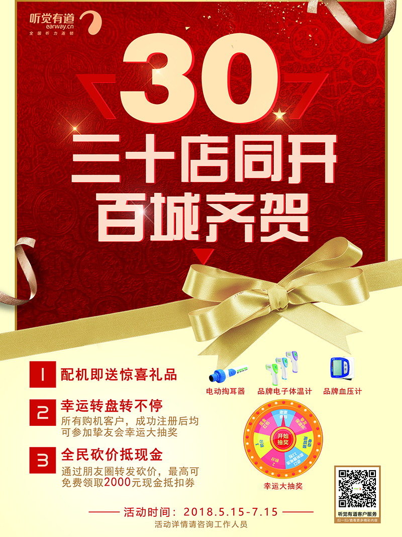 <span style="font-size:16px;"><img src="/upfiles/201805140533309372.jpg" alt="" /><br /></span></p><p style="text-align: center;"><span style="font-size:16px;"><br /></span></p><p><span style="font-size:16px;"> 聽覺有道助聽器驗配中心30家門店于5月15日正式開業,百城同慶!</span></p><p><span style="font-size:16px;"> 聽覺有道是一家高端、專業的全國聽力連鎖機構,有著近30年的助聽器驗配經驗,是廣東聽覺有道企業管理有限公司旗下品牌。</span></p><p><span style="font-size:16px;"> 公司現有專家級驗配師400多名,驗配服務中心遍布華西、華東、華南、華北主要省市,同時與GN集團進行戰略合作,代理美國貝爾通助聽器等助聽器品牌,擁有多條產品線:聽力篩查聽力篩查,聽力診斷,平衡診斷,助聽器驗配及專家級軟件(聽力診斷設備操作系統與患者信息服務管理系統),行業內領先的無線藍牙助聽器通訊技術,為聽障朋友提供一站式助聽器驗配解決方案!</span></p><p><span style="font-size:16px;"> 作為助聽器驗配行業的專業服務者,專業的驗配環境,專家級的驗配師,將時刻秉承專業全面的服務、豐富的驗配經驗及先進的驗配設備,同時為聽障朋友提供康復指導及助聽器售后服務,讓聽障朋友更好更放心地傾聽!</span></p><p style="text-align: center;"><span style="font-size:16px;"> <strong>我們的新門店地址(30家):</strong></span></p><p><span style="font-size:16px;"></span></p><p></p><p style="text-align: center;"><span style="font-size:16px;"> <strong>聽覺有道華南高端驗配中心</strong></span></p><p style="text-align: center;"><span style="font-size:16px;"><strong><img src="/upfiles/201805151039587785.png" alt="" /><br /></strong></span></p><p style="text-align: center;"><span style="font-size:16px;"> 電話:020-87066099</span></p><p style="text-align: center;"><span style="font-size:16px;"> 地址:廣州市天河區體育東路122號羊城國際商貿中心西塔1108(地鐵體育中心B出口前行100米,專家坐診,只接受預約)</span></p><p style="text-align: center;"><span style="font-size:16px;"><br /></span></p><p style="text-align: center;"><span style="font-size:16px;"> <strong>聽覺有道內蒙古呼市烏蘭察布服務中心</strong></span></p><p style="text-align: center;"><span style="font-size:16px;"><strong><img src="/upfiles/201805151040168591.png" alt="" /><br /></strong></span></p><p style="text-align: center;"><span style="font-size:16px;"> 電話:0471-3977839、13514714042</span></p><p style="text-align: center;"><span style="font-size:16px;"> 地址:內蒙古呼和浩特市賽罕區烏蘭察布東街路北(招商考試中心旁)</span></p><p style="text-align: center;"><span style="font-size:16px;"><br /></span></p><p style="text-align: center;"><span style="font-size:16px;"> <strong>聽覺有道成都金堂服務中心</strong></span></p><p style="text-align: center;"><span style="font-size:16px;"><strong><img src="/upfiles/201805151040458276.png" width="500" alt="" /><br /></strong></span></p><p style="text-align: center;"><span style="font-size:16px;"> 電話:17780478558</span></p><p style="text-align: center;"><span style="font-size:16px;"> 地址:成都市金堂縣趙鎮十里大道300號(一橫道路口)</span></p><p style="text-align: center;"><span style="font-size:16px;"><br /></span></p><p style="text-align: center;"><span style="font-size:16px;"> <strong>聽覺有道四川雅安服務中心</strong></span></p><p style="text-align: center;"><span style="font-size:16px;"><strong><img src="/upfiles/201805151041171639.png" alt="" /><br /></strong></span></p><p style="text-align: center;"><span style="font-size:16px;"> 電話:17738307596</span></p><p style="text-align: center;"><span style="font-size:16px;"> 地址:雅安市雨城區大南街22號(天主教堂對面)</span></p><p style="text-align: center;"><span style="font-size:16px;"><br /></span></p><p style="text-align: center;"><span style="font-size:16px;"></span></p><p style="text-align: center;"><span style="font-size: 16px;"> <strong>聽覺有道東營廣饒服務中心</strong></span></p><p style="text-align: center;"><span style="font-size: 16px;"><strong><img src="http://m.letianwh.cn/upfiles/20180515104347120.png" alt="" /><br /></strong></span></p><p style="text-align: center;"><span style="font-size: 16px;"> 電話:0546-6281512</span></p><p style="text-align: center;"><span style="font-size: 16px;"> 地址:東營市廣饒縣花苑路與兵圣路十字路口東行20米路北(醫藥公司對面)</span></p><p style="text-align: center;"><span style="font-size: 16px;"><br /></span></p><p style="text-align: center;"><span style="font-size: 16px;"> <strong>聽覺有道河南洛陽服務中心</strong></span></p><p style="text-align: center;"><span style="font-size: 16px;"><strong><img src="http://m.letianwh.cn/upfiles/201805151044003400.png" alt="" /><br /></strong></span></p><p style="text-align: center;"><span style="font-size: 16px;"> 電話:0379-64324338、16637990858</span></p><p style="text-align: center;"><span style="font-size: 16px;"> 地址:河南省洛陽市澗西區景華路8號(潤峰廣場正對面)</span></p><p style="text-align: center;"><span style="font-size: 16px;"><br /></span></p><p style="text-align: center;"><span style="font-size: 16px;"> <strong>聽覺有道山東聊城服務中心</strong></span></p><p style="text-align: center;"><span style="font-size: 16px;"><strong><img src="http://m.letianwh.cn/upfiles/201805151044136324.png" alt="" /><br /></strong></span></p><p style="text-align: center;"><span style="font-size: 16px;"> 電話:0635-8800602,15653110810</span></p><p style="text-align: center;"><span style="font-size: 16px;"> 地址:山東省聊城市東昌府區興華西路2號(五星百貨斜對面)</span></p><p style="text-align: center;"><span style="font-size: 16px;"><br /></span></p><p style="text-align: center;"><span style="fon