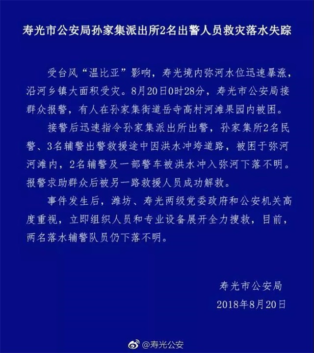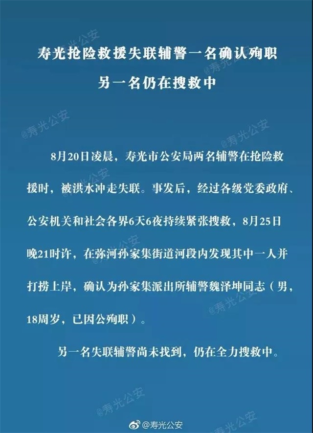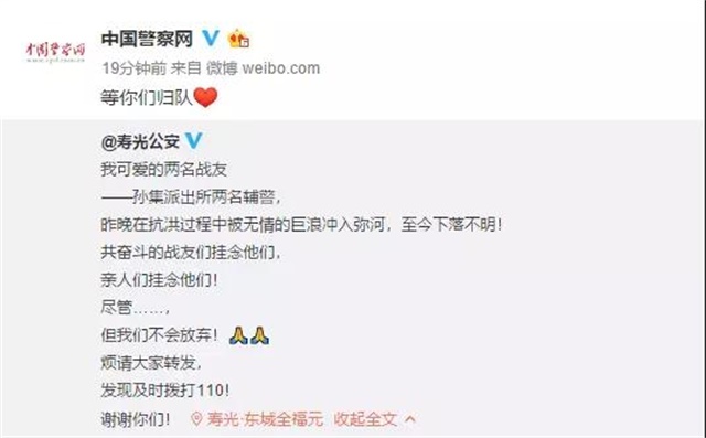 2018年8月20日凌晨,壽光市兩名輔警在搶險救援時,被洪水沖走失聯。事發后,經過連續幾天的緊張搜救,他們以我們最不愿意看到的方式歸來了。
