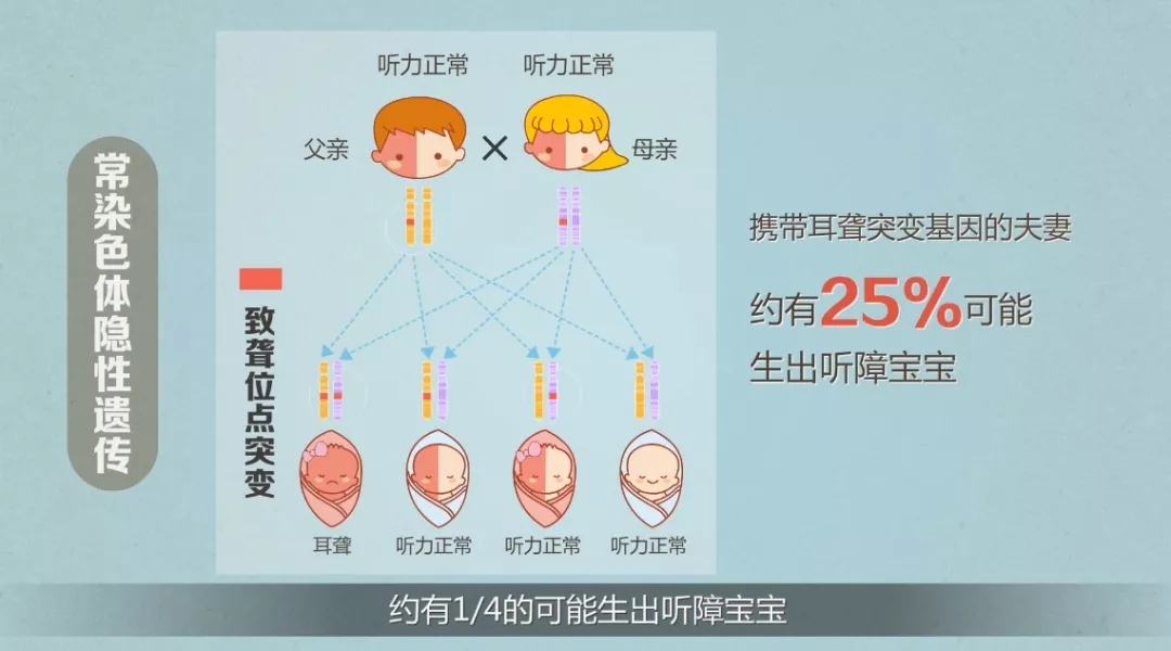 遺傳性耳聾的遺傳方式多數為:“常染色體隱性遺傳”和“線粒體母系遺傳”常染色體隱性遺傳,雙方聽力正常的攜帶者,約有1/4的可能生出聽障寶寶。線粒體基因突變屬于母系遺傳。